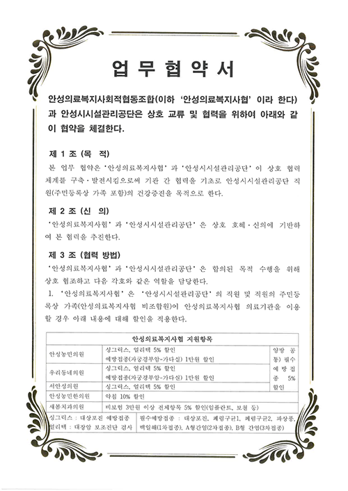 안성의료복지사회적협동조합과 안성시시설관리공단간의 상호교류 및 협력