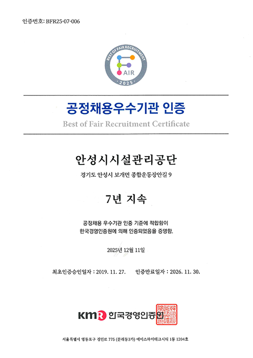공정채용우수기관 인증서